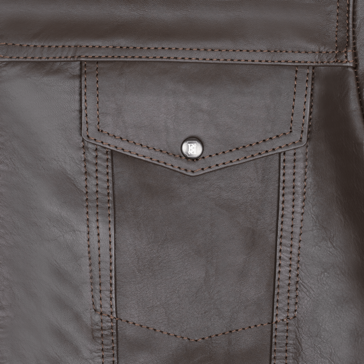 avec une élégance minimaliste, le modèle Brixton revisite la veste utilitaire classique avec un cuir d'agneau, un col chemise structuré et des poches poitrine à rabat. Une silhouette droite, rehaussée d’une doublure satinée bordeaux et de finitions soignées signées BLEATHER.